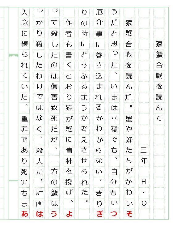 J’ai lu « Le Combat entre le singe et le crabe ». J’ai eu pitié / du crabe et de ses amis. Ma vie est paisible aujourd’hui, mais je ne saurai jamais si je ne finirai pas / un jour dans une situation difficile comme la leur. Ça me fait / réfléchir à ce que je ferais si j’étais à leur place.