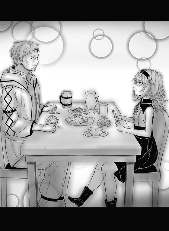 Puisque même moi avais été réduit à un état de béatitude, on pouvait probablement deviner sans peine quelle réaction Mewi avait eue en goûtant de la viande panée pour la première fois. Au début, elle approcha timidement de sa bouche la viande de sanglier, mais après une bouchée, puis deux, son expression s’éclaira à toute vitesse. Elle avait l’air complètement abasourdie en se jetant sur la viande.